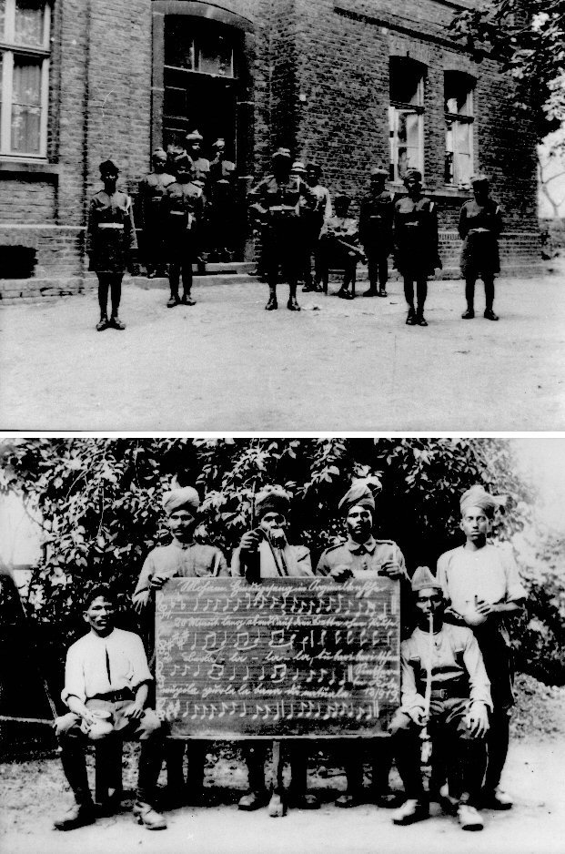 Einquartierung indischer Soldaten in der Sintherner Schule (heute Brauweiler Straße) im September 1919 . 1. Bild (Aufnahme 10.09.1919): Nach dem ersten Weltkrieg waren in der Sintherner Schule kurzfristig indische Soldaten einquartiert, Hindus wie Mohammedaner . 2. Bild (Aufnahme 12.09.1919): Ihre religiösen Gesänge hat der Sintherner Lehrer und Organist Jean Esser in Noten gesetzt und mit Text versehen.