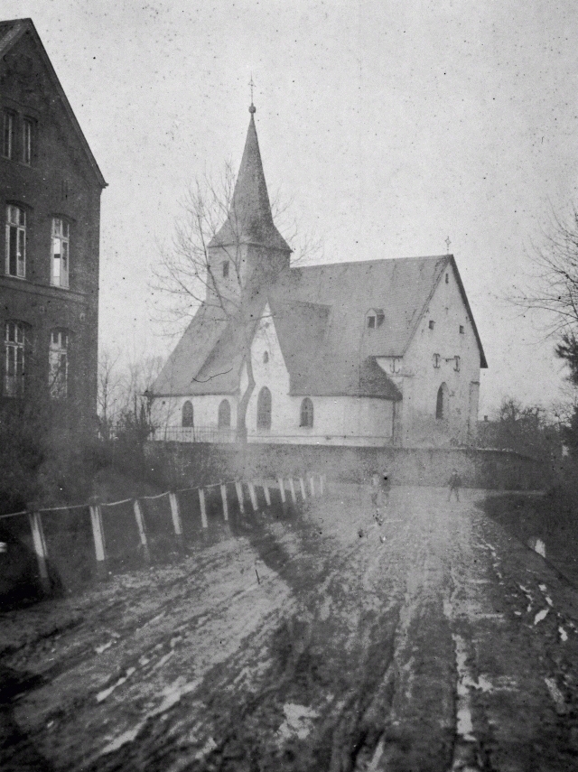 Die alte, romanische Kirche in Geyen aus dem 17. Jahrhundert wurde 1893 niedergelegt. An deren Stelle wurde im gleichen Jahr mit dem neugotischen Bau der heutigen Kirche begonnen, die ein Jahr später bereits eingeweiht wurde. Links steht die alte Schule, in der heute der katholische Kindergarten untergebracht ist.