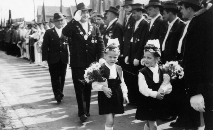 Die Zwillinge am 17. Juli 1955 bei der Aufstellung zum Schützenfestzug in Sinthern mit Schützenkönig Matthias Hallstein und dahinter Severin Fühlen
