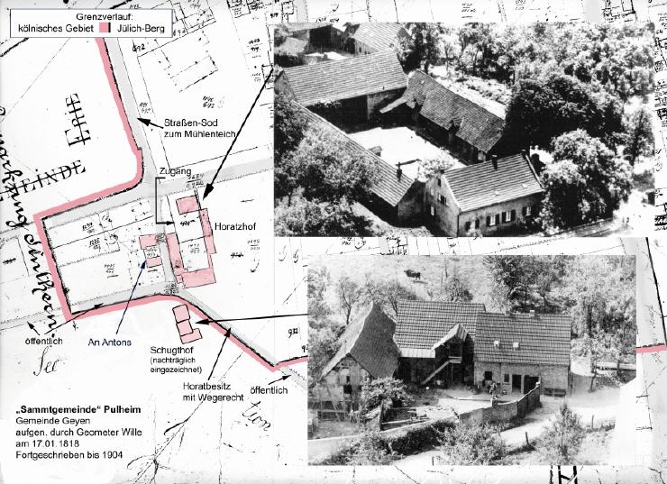 Die Rather Straße gehört mit zu den ältesten ausgebauten Straßen des Ortes. Sie wurde vorwiegend als Zugang zu den Höfen (oben der Horatz-Hof (Luftaufnahme aus den fünfziger Jahren), unten der Schugt-Hof) genutzt. Vor dem Schugt-Hof gab es bis ca. 1840 noch einen kleineren Hof (Antons, oder auch Tünns Hüsje genannt), der dem Feldstück seinen Namen „An Antons“ gab. In der Katasterzeichnung (Hintergrund) der „Sammtgemeinde Pulheim“ von 1818 (leider fortgeschrieben bis 1904) ist dieser alte Hof noch sichtbar, er lag auf Geyener Land.