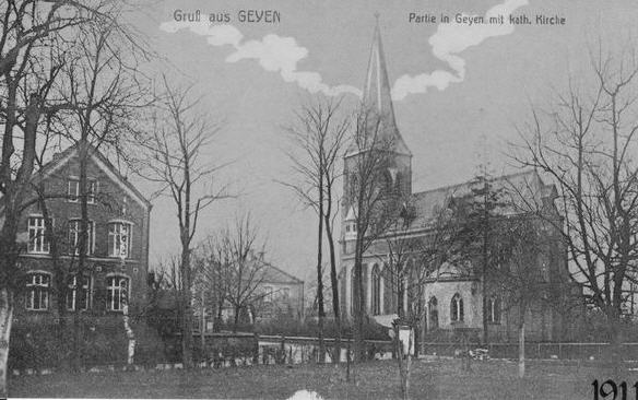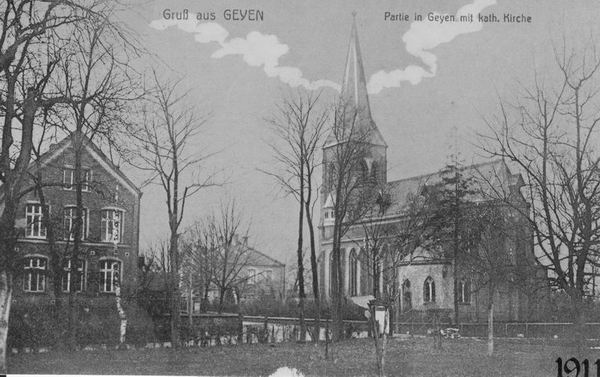 Pfarrkirche Sankt Cornelius mit Schulgebäude (links) vom Domhof gesehen. Im Hintergrund erkennt man das Pastorat. Die Postkarte wurde von dem Organist Winand Klein vertrieben, der auch einen Kolonialwarengeschäft betrieb.