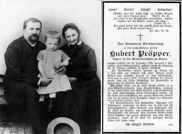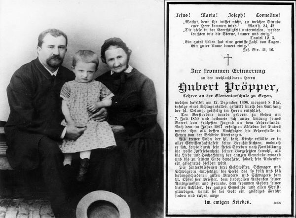 Lehrer Hubert Pröpper mit Familie (Großmutter mit ihrem Enkel Hubert Schurf - Neffe von Hubert Pröpper) um 1890. Rechts der Totenzettel von dem Leiter der Geyener Elementarschule, der am 12. Dezember 1896 verstarb.