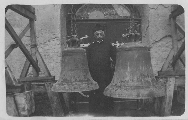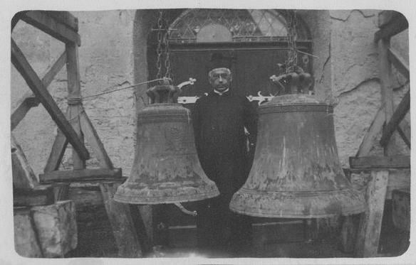 Pastor Gottfried Haaken (Pastor in Sinthern von 1908-1944) um 1924 mit Glocken vor den Hauptportal der Pfarrkirche St. Martinus.