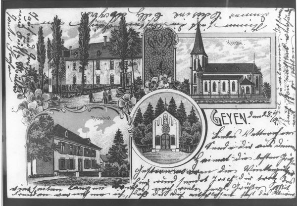 Die ursprünglich farbige Postkarte zeigt eine fantasievolle Ansicht des Dorfes Geyen mit der Pfarrkirche St. Cornelius von 1893, den Junkerhof, den Domhof und die Schutzengelkapelle.