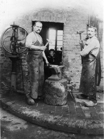 Schmied und Landwirt Faßbender (links) mit seinem Gesellen Johannes PrangBild- und Textquelle: Verein für Geschichte e.V. Pulheim