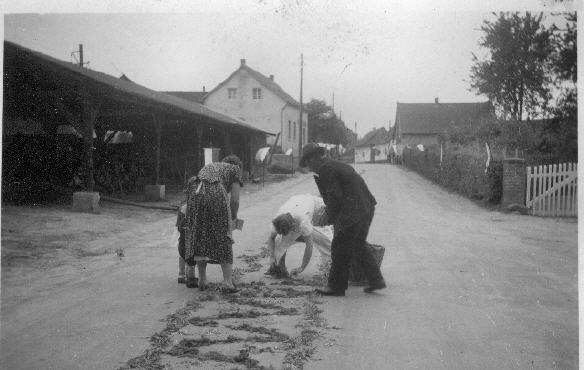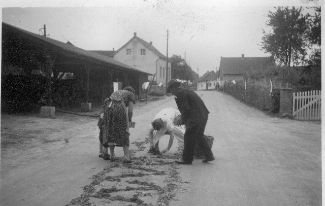 Familie Pingen beim traditionellen Schmücken der Kreuzstraße mit Blumen für das Fronleichnamsfest. Die Scheune auf der linken Seite des Bildes existiert heute nicht mehr.