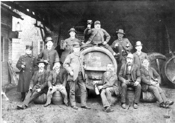 Links vor dem Fass steht mit einer langen Pfeife in der Hand Brauereibesitzer Josef Büsterbach. Auf dem Fass sitzt sein Bruder. Dieser war infolge einer Wirbelsäulenverkrümmung sehr kleinwüchsig und wurde im Dorf liebevoll „Ottobuckel“ genannt. Rechts vom Fass steht mit einem Bierglas in der Hand der Küster und Organist Winand Klein, der bis zu Beginn der 1930er Jahre neben dem Gasthaus der Geschwister Balsam ein Kolonialwarengeschäft betrieb und dort Ansichtskarten von Geyen verkaufte, die er selbst herausgab. Foto vermutlich von 1890.