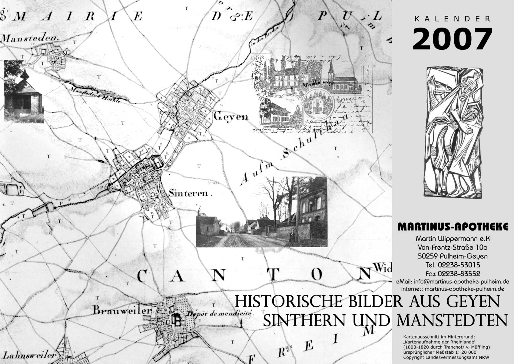 Der Hintergrund ist ein Ausschnitt aus den historischen, topographischen Karten (ursprünglicher Maßstab 1:20.000) der Rheinlande (Blatt 71 Lövenich), die zunächst durch französische Ingenieuroffiziere unter der Leitung des Obersten Jean Joseph Tranchot ab 1803 erstellt wurden und später ab 1817 durch preußische Offiziere unter der Leitung des Generalmajors Friedrich Karl Ferdinand Freiherr von Müffling durch die Aufnahme der linksrheinischen Gebiete bis 1828 fortgeführt wurden.