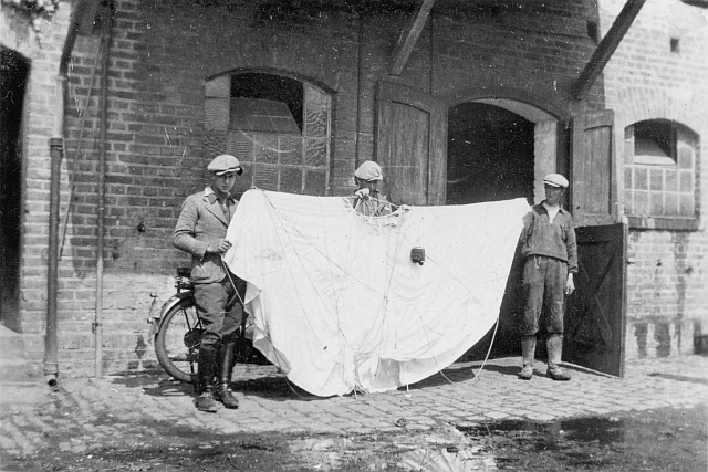 Um 1940/1941 von Alois Juris auf dem Feld gefundener Fallschirm einer Leuchtbombe der Alliierten (hier auf dem Domhof in Geyen)
