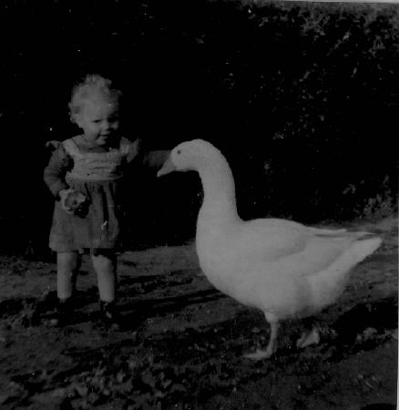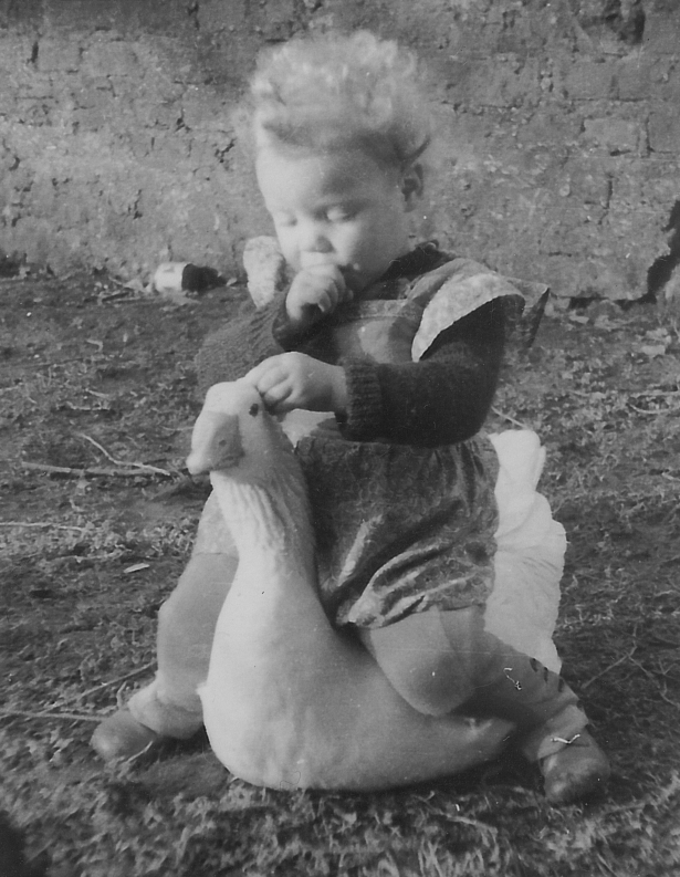 Die Fotos von 1954 zeigen die damals zweijährige Eleonore Wolter auf der Ölmühle mit ihrer Lieblingsgans, die jeden Morgen zur gleichen Zeit auf die Kleine wartete, sich hinhockte, um ein Stündchen mit ihr zu schmusen.