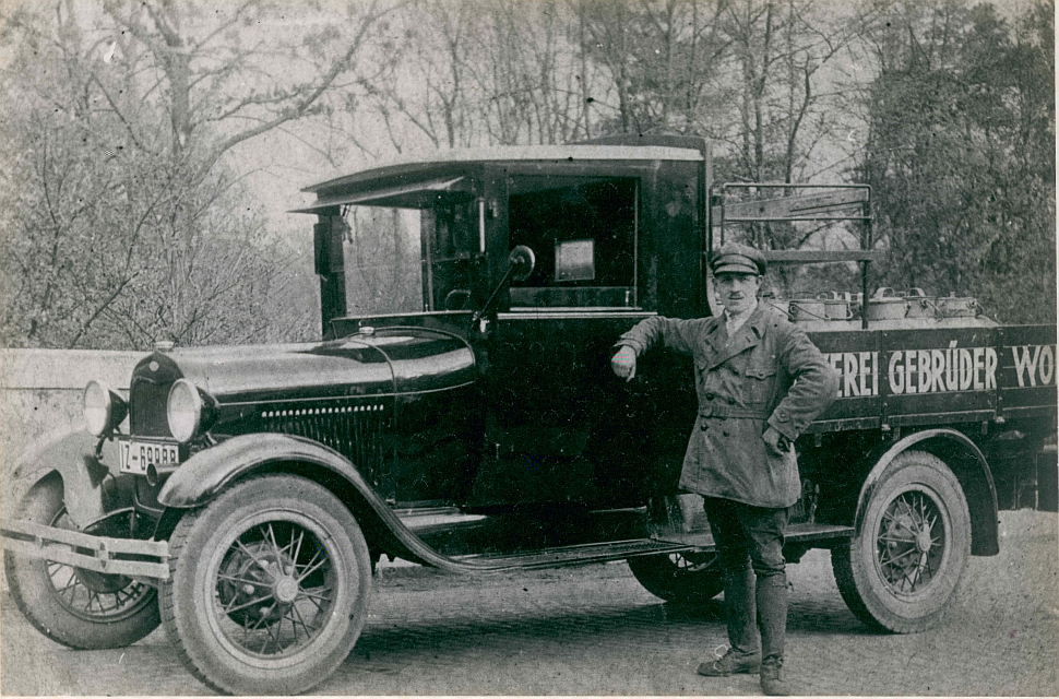 Peter Schumacher mit einem LKW der Molkerei Wolter von der Ölmühle in Sinthern. in den 1920er Jahren. Peter Schumacher war der Schwager des Molkereibesitzers Arnold Wolter.