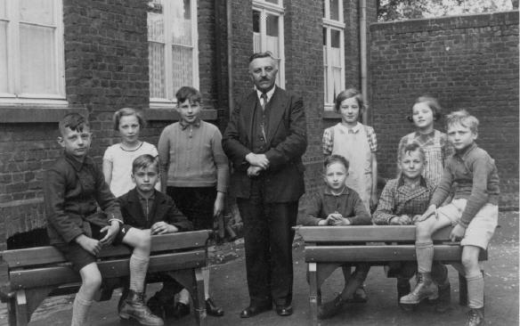 Die Schüler des Jahrgangs 1928/29 hinter dem damaligen Schulgebäude auf der heutigen Brauweiler Straße. Die Aufnahme dürfte um 1940 entstanden sein. v.l.n.r. Johann Boes, Christel Juris, Willi Robens, Peter Krings, Lehrer Hoch, Theo Pluskotta, Käthe Fauler, Heinrich Schmitz, Kathi Röllgen, Heinrich Effertz