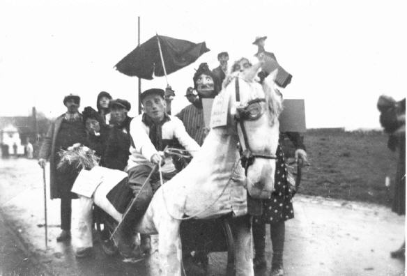 Gruppe um Johann Winckler (auf dem „Pferd“) mit Bernhard Mohr (mit Pfeife), Willi Burbach (3.v.l.) und Josef Brüggen (mit Maske)