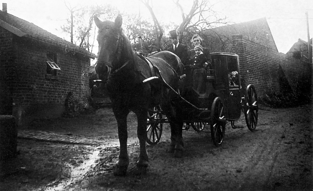 Maria Schlangen (verh.Kelz) mit Elisabeth Schlangen (geb. Faßbender) und Konrad Faßbender wurde als einjähriges Kind feierlich in Manstedten hier im Sintherner Weg, der damals noch Nebenstraße hieß, aufgenommen. Nachdem ihre leibliche Mutter verstorben war, wurde sie von Elisabeth Schlangen wie ihr eigenes Kind erzogen. Schon die Großmutter Sybille Faßbender benutzte die Kutsche für Fahrten von ihrem landwirtschaftlichen Hof nach Sinthern oder Pulheim. Die Kutsche wurde 1952 nach Köln-Ehrenfeld verkauft, nachdem Sybille Faßbender im Alter von 92 Jahren verstorben war.