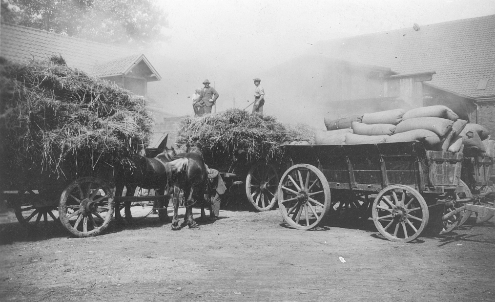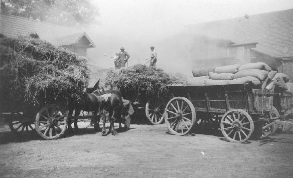Die Aufnahme dürfte Anfang der dreißiger Jahre entstanden sein, als Heinz Böcker auf dem Hof als Volontärverwalter arbeitete. Möglicherweise wird auf dem Bild gerade mit größerer Staubentwicklung Getreide gedroschen, da die beiden Wagen auf der rechten Seite mit Getreidesäcken beladen sind. Ob die beiden anderen Wagen Heu, Stroh oder Getreidegarben geladen haben, lässt sich nicht genau erkennen. Damals war es üblich, dass geschnittene Getreide in Garben zu binden und später zu dreschen. Heutzutage wird das Getreide mittels moderner Mähdrescher in einem Gang gemäht, gedroschen, von der Spreu