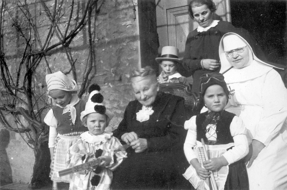 v.l.n.r.: Maria-Gertrud (Marita) Schumacher, Engelbert Schumacher, Sybille Hartzheim, Franz Schumacher, „Tante Julchen“, Hildegard Schumacher, Ordensschwester vom Krankenhaus Stommeln (Cellitinnen von St. Maria). Die nicht mehr namentlich bekannte Ordenschwester pflegte Sybilla Hartzheim, die im gleichen Jahr am 23. August verstarb.