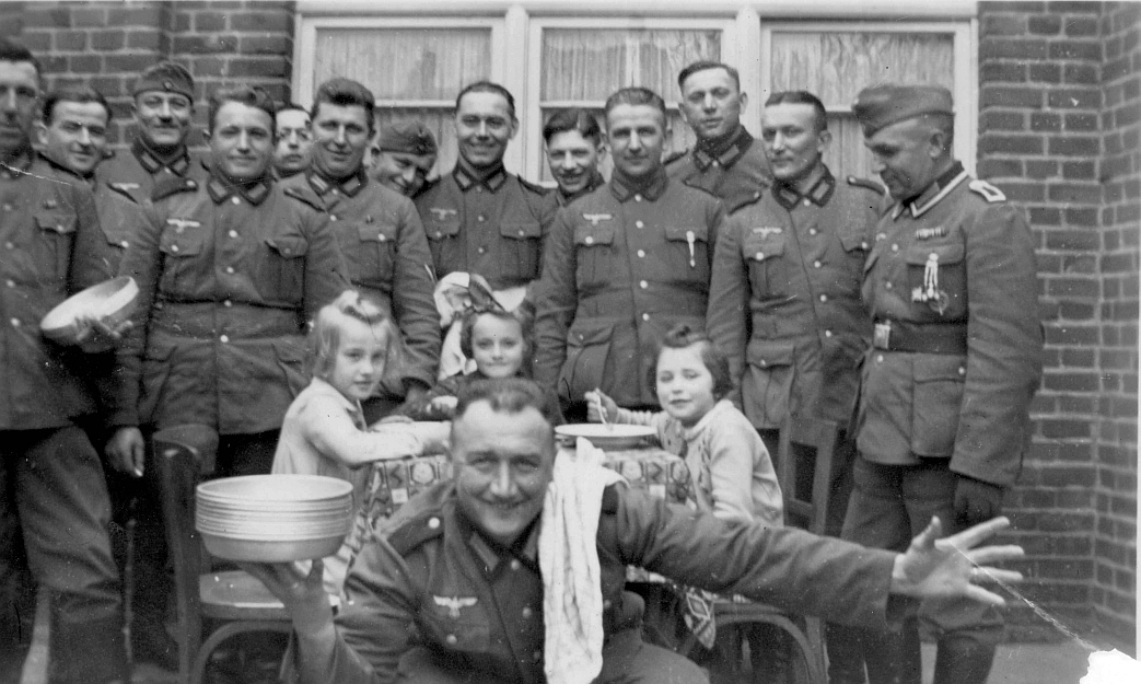 Kinder v.l.n.r.: Marianne Pingen, Margret Fühlen, Gertrud Zweiacker mitWehrmachtssoldaten im Hof der ehemaligen Gaststätte PrangBild- und Textquelle: Gertrud Probst (geb. Zweiacker)