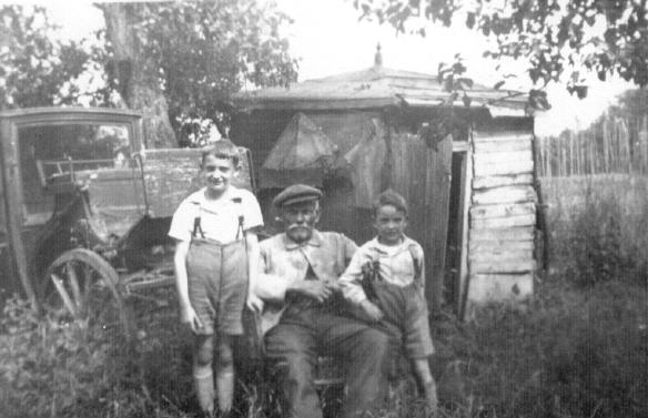 Das ist nicht Mark Twain mit seinen beiden Helden, sondern Konrad Faßbender mit seinen Enkeln Heinrich Fetten (links) und Konrad Fetten (rechts) vor dem Bienenhaus in Sinthern.