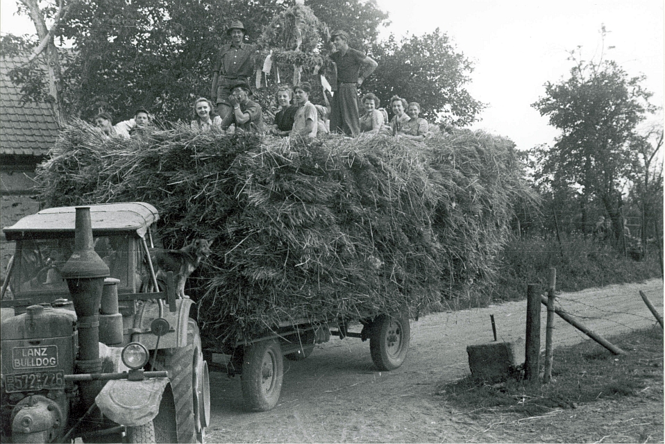 des Lanz-Bulldog-Treckers müsste Severin Fühlen gewesen sein. Das Foto ist wahrscheinlich an der heutigen Ecke Brauweiler Straße/ An der Wasserkaul gegenüber dem Fronhof aufgenommen wurden. Das kleine Fachwerkhaus links ist heute noch vorhanden. Der Anhänger hat Getreidegarben geladen.