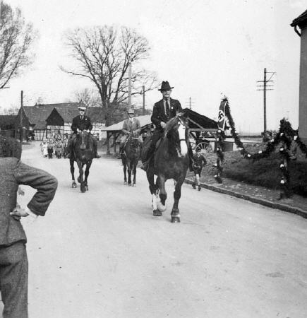 Der erste Reiter war der Ortsbauernführer Wilhelm Käsch, links Eberhard Fetten. Die Aufnahme entstand in der heutigen Kreuzstraße. Das Fachwerkhaus im Hintergrund befindet sich heute an der Ecke Brauweiler Straße/An der Wasserkaul. Der 1. Mai wurde 1936 von den Nationalsozialisten als „Nationaler Feiertag des deutschen Volkes“ gefeiert. Gewerkschaften waren seit dem 02. Mai 1933 in Deutschland verboten.