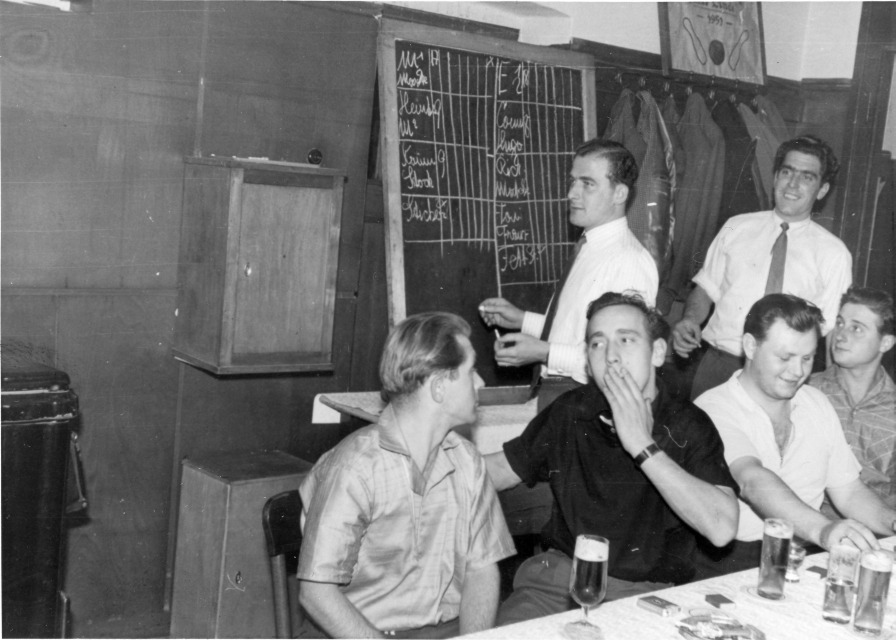 Obere Reihe v.l.n.r.: Willi Sticker (an der Tafel) und der damalige Wirt Heinz Esser