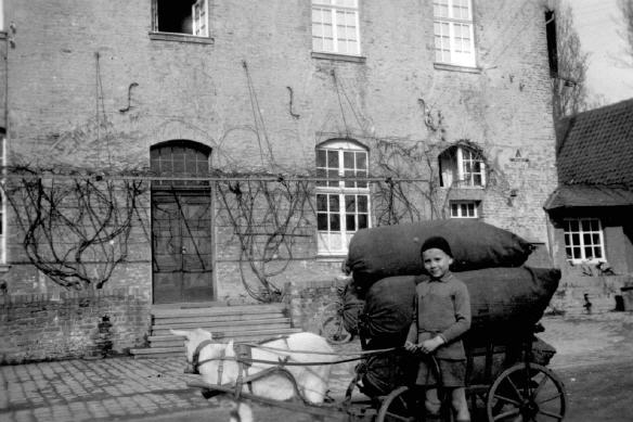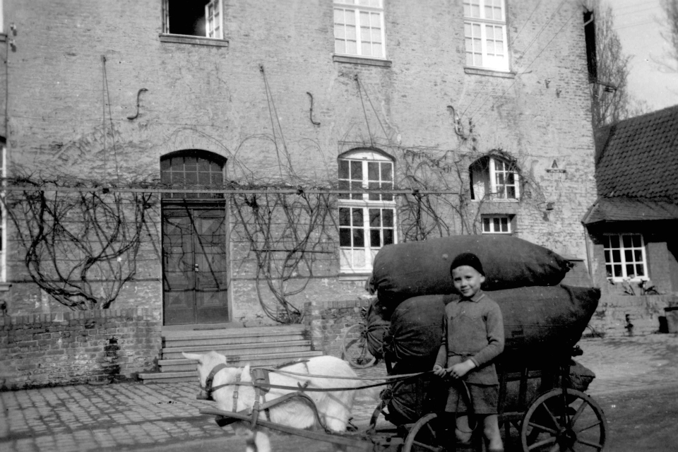 Der siebenjährige Engelbert Schumacher mit seinem Ziegenkarren im Innenhof des Geyener Junkerhofes 1939 mit Blick auf die Rückseite des Haupthauses.Bild- und Textquelle: Maria Niedeggen (Erftstadt)