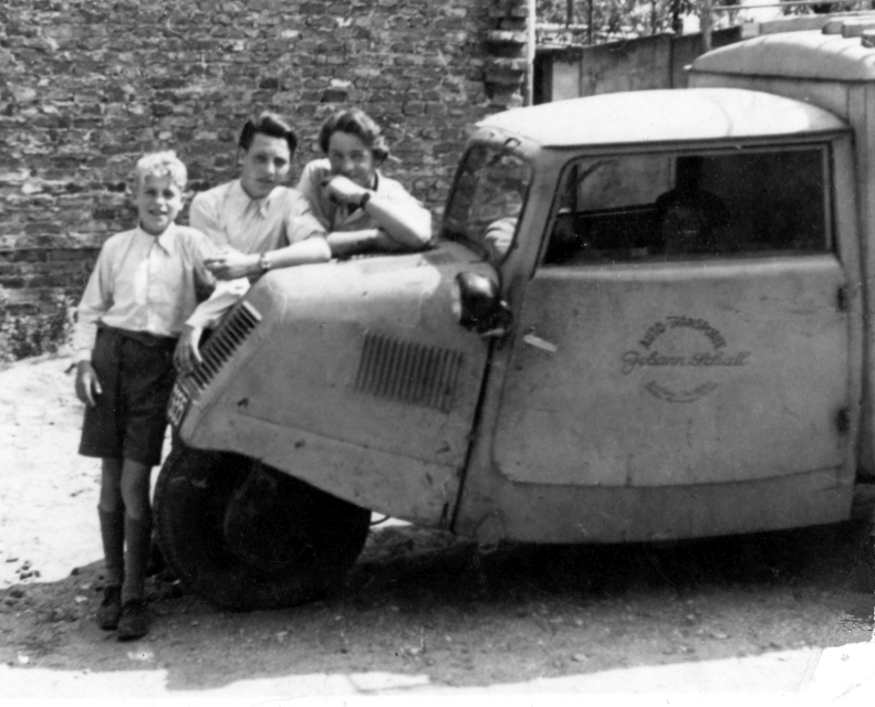 Auf dem zweiten Bild Johann Schall in seinem Kastenwagen der Marke Tempo. Davor die Jungen Johannes Kann, Helmut Wolter und Horst Ortmann (v.l.n.r.). Die Aufnahme stammt aus dem Jahr 1949.