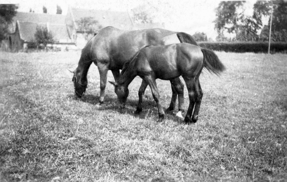 Die beiden Pferde des Manstedtener Landwirtes und Pferdeliebhabers Josef Pesch, der zu dieser Zeit als Pächter den Konradshofs bewirtschaftete. Im Hintergrund erkennt man den Domhof, vor dem die Büsdorfer Straße verläuft.