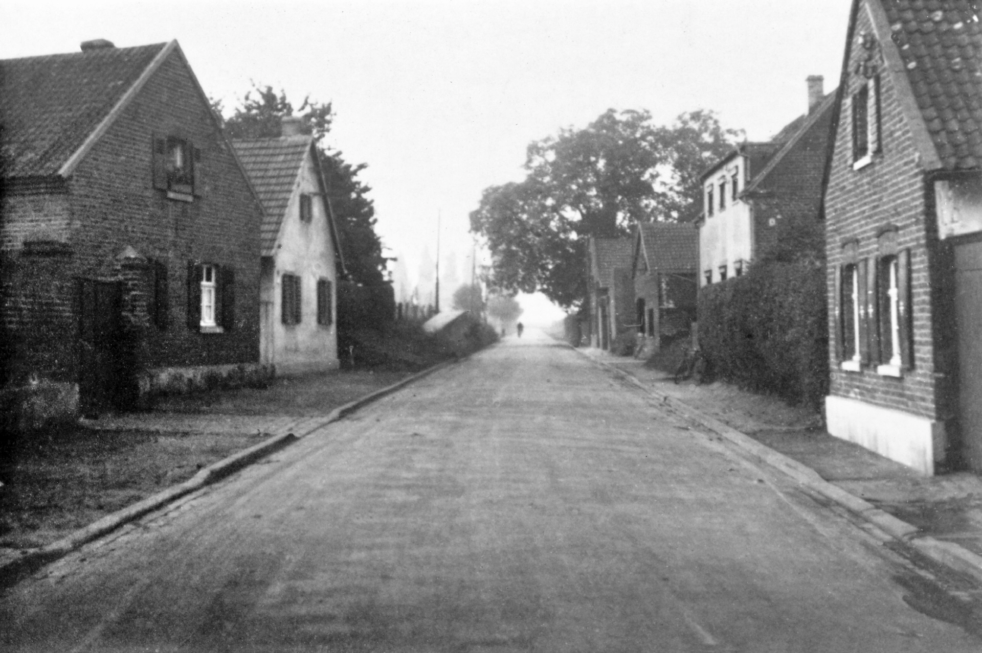 Die Manstedtener Straße in Richtung Ortsausgang nach Manstedten. Auf der linken Seite die Häuser der Familien Burbach und Baus, auf der rechten Straßenseite die Häuser der Familien Lambertz, Drack, von Dynhoven und Winckler.