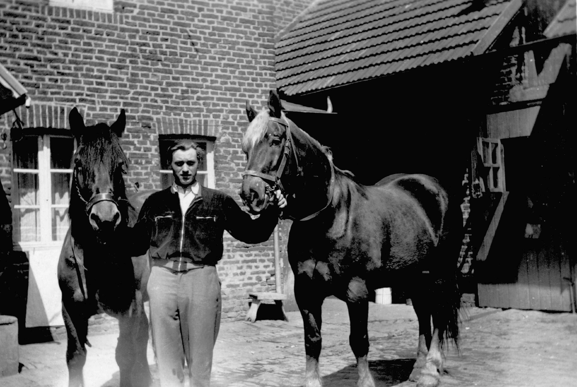 Der Sintherner Landwirt Hermann-Josef Fetten mit zwei Pferden auf seinem Hof im Mai1951Bild- und Textquelle: Hermann-Josef Fetten