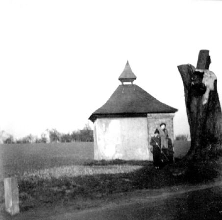 Die kleine Kapelle mit Katharina und Georg Schreier um 1950. Von der großen Linde ist schon zu diesem Zeitpunkt nur noch der Stamm übrig (siehe auch Kalender 2005).