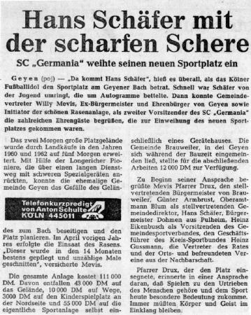 Hans Schäfer („De Knoll“, * 19. Oktober 1927 † 7. November 2017) bei der Einweihung des Geyener Sportplatzes am 19./20. Juni 1965 als besonderer Ehrengast. Der legendäre Linkaußen gehörte zur deutschen Fußballnationalmannschaft, die am 04. Juli 1954 in einem denkwürdigen Finale die Ungarn besiegte und damit Weltmeister wurde („Wunder von Bern“).