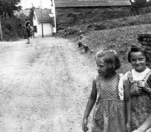 Zwei Mädchen auf der Mühlenstraße (heute: Dammstraße) mit Blick auf das Haus der Familie Porschen in SinthernBild- und Textquelle: Ute Biesenbach (Zülpich)