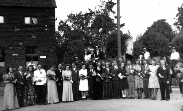 Das Maikönigspaar Johann Hansen und Elfriede Hoepp mit ihrem Gefolge vor der Gaststätte Prang in Sinthern. Hinter der Gaststätte befand sich ein großer Saal, in dem die Dorffeste gefeiert wurden.