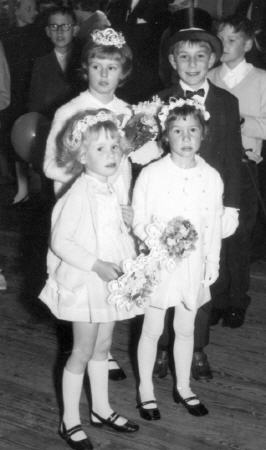 Die Aufnahme vom 12. Mai 1968 zeigt das „Kindermaikönigspaar„ Britta Schieffer und Joachim Effertz mit den zwei Blumenkindern Ellen Effertz und Claudia Deckstein auf dem Maifest der Maigesellschaft „Weißer Flieder„.
