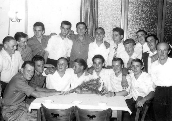 Siegesfeier der zusammengewürfelten Sintherner Mannschaft nach einem Turnier mit den Firmenmannschaften der Frechener bzw. Königsdorfer Steinzeugwerke wie z.B. Cremer & Breuer, Franz Hensmann AG und andere im Jahr 1958. Der Preis für die Siegermannschaft waren 100 DM (damals ein kleines Vermögen) und 10 Stiefel Bier.