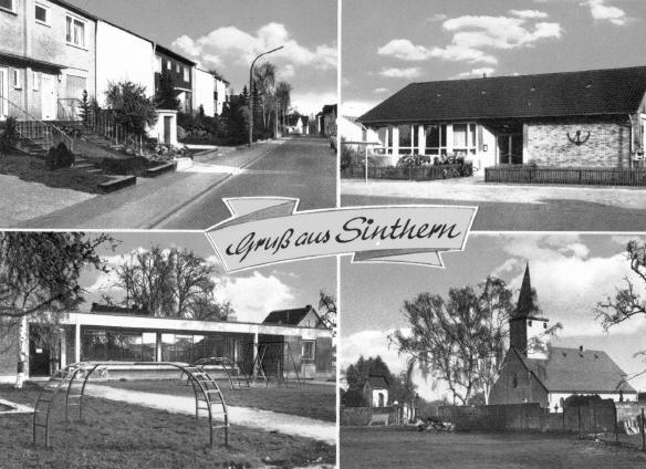 Die kolorierte Postkarte mit den Ortansichten aus dem Sinthern der siebziger Jahre zeigt den vorderen Teil der Kreuzstraße in nördlicher Richtung (links oben), den Anbau der alten Volksschule in der Brauweiler Straße (oben rechts), dem Kindergarten und Jugendheim(Bau 1963/64) neben der Kirche (unten links) und der Sintherner Pfarrkirche St. Martinus (unten rechts)