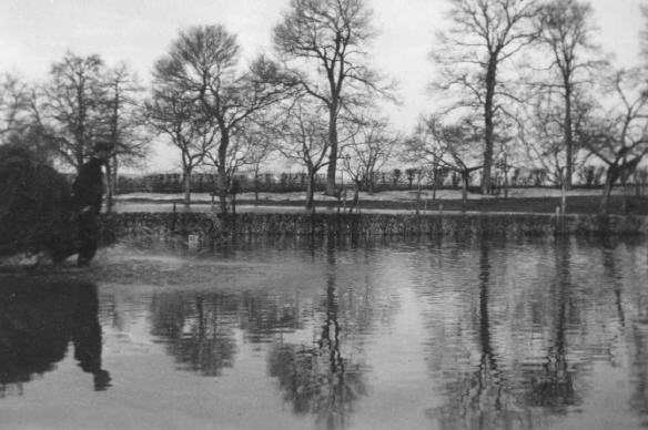 Die überflutete Wiese vor dem Junkerhof mit Blick auf die Straße von Geyen nach Pulheim beim Hochwasser am 24.02.1940. Bild- und Textquelle: Marita Niedeggen, (Erftstadt-Frauenthal)