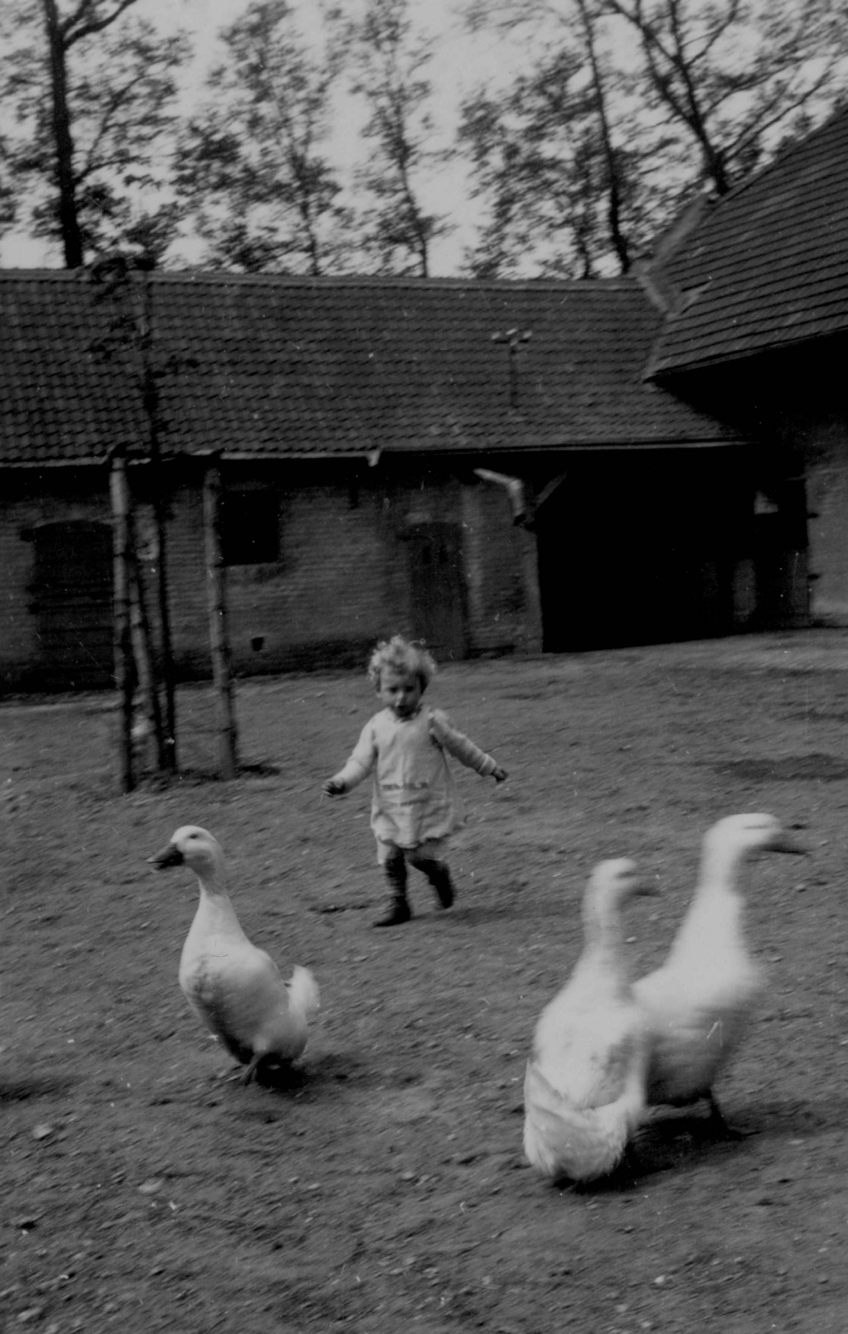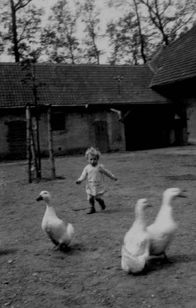 Franz Schumacher im Jahr 1929 im Innenhof des Geyener Junkerhofs mit Gänsen. Bild- und Textquelle: Marita Niedeggen, (Erftstadt-Frauenthal)