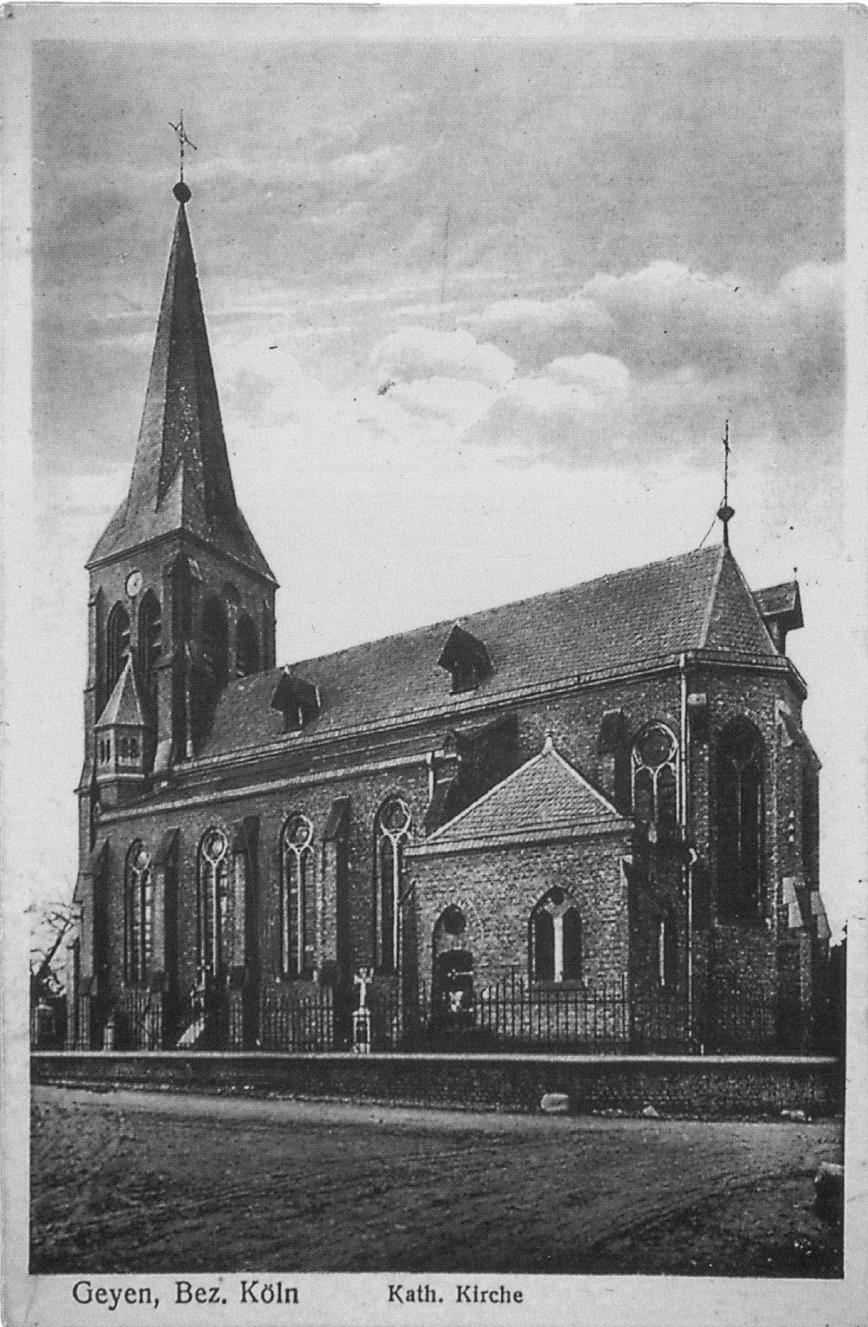 Die auf der Postkarte abgebildete neugotische katholische Pfarrkirche St. Cornelius in Geyen von 1892/93 ersetzte die kleinere mittelalterliche romanische Kirche am gleichen Ort. Die Planung der Kirche stammt vom Kölner Architekten Theodor Roß. Die Karte wurde vom Frankfurter (a.M.) Verlag Willy Flächner aufgelegt. Der Erlös der Karte wurde für neue Glocken verwendet.